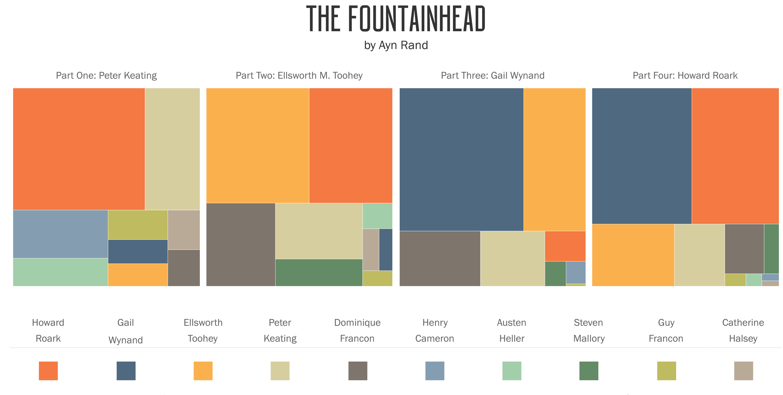 Ayn Rand also divided The Fountainhead into four sections, with each section named after a different main character - Peter Keating, Ellsworth M. Toohey, Gail Wynand, Howard Roark.